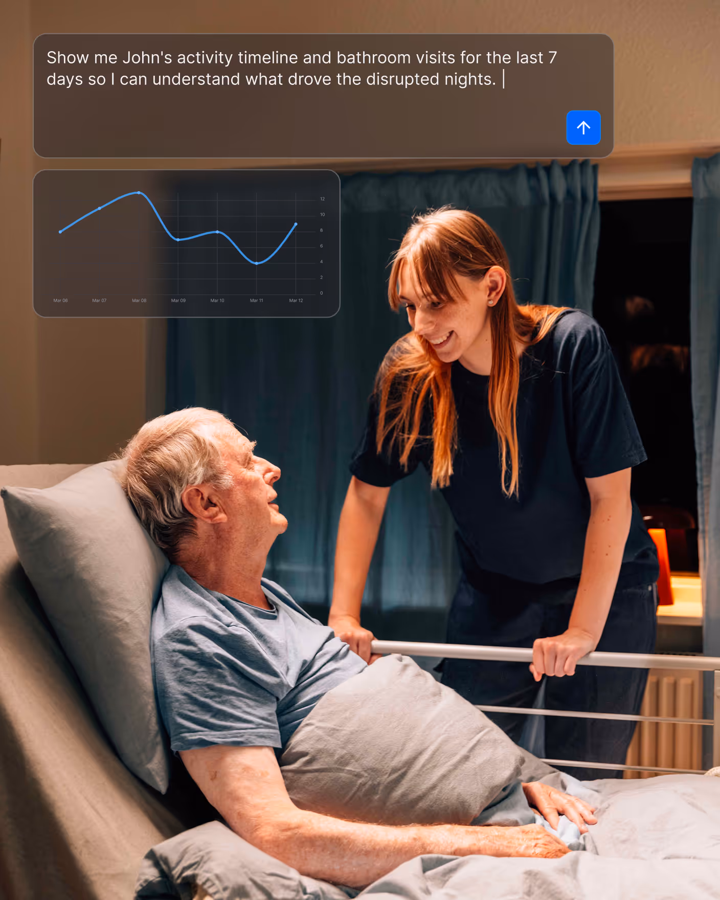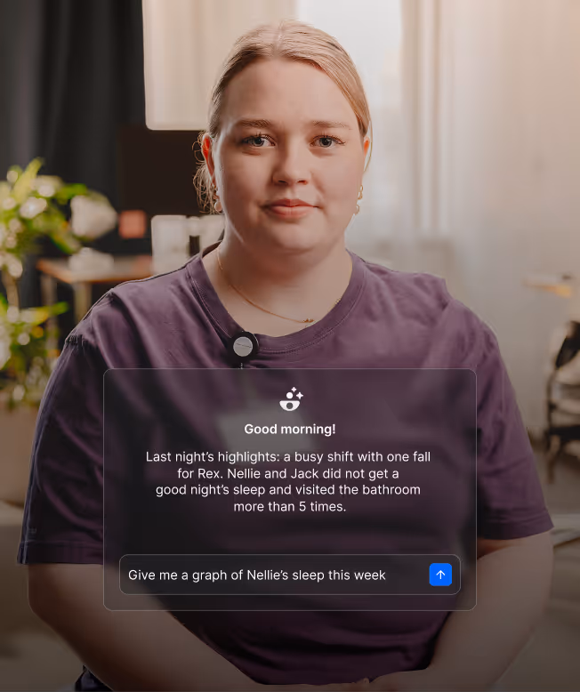 Ask questions about your residents and building. Get clear answers from your actual monitoring data, instantly, on shift. Less time looking at charts, more time providing the care residents deserve.